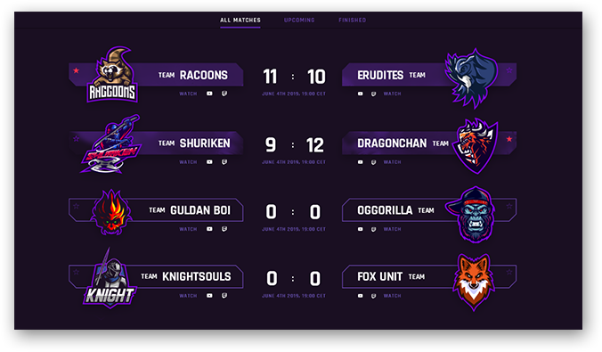 Packed with a fantastic layout for displaying match lists and all the participating teams. Your visitors can view upcoming, finished or all matches, and all that with just a single click.